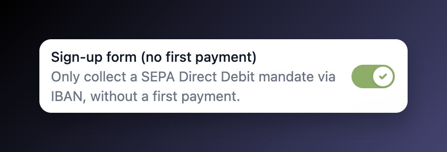 For Advanced Subscription payment links, you can now enable sign-up without an initial payment. When enabled, customers can enter their details and IBAN to activate the subscription.